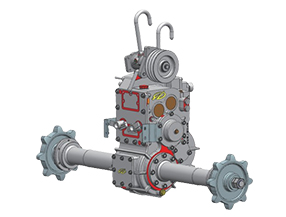 (8)箱体结构采用整体箱,不拆卸履带的情况下也能维修,箱体前侧带检修孔盖,可在不开箱的前提下,拆卸半轴维修,大幅提升维修效率;